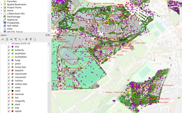 Our main goal: monitor and map biodiversity across university-managed properties. Thus developing a database of species across a diverse range of taxa, which can be used to inform University Biodiversity Strategy and management plans.